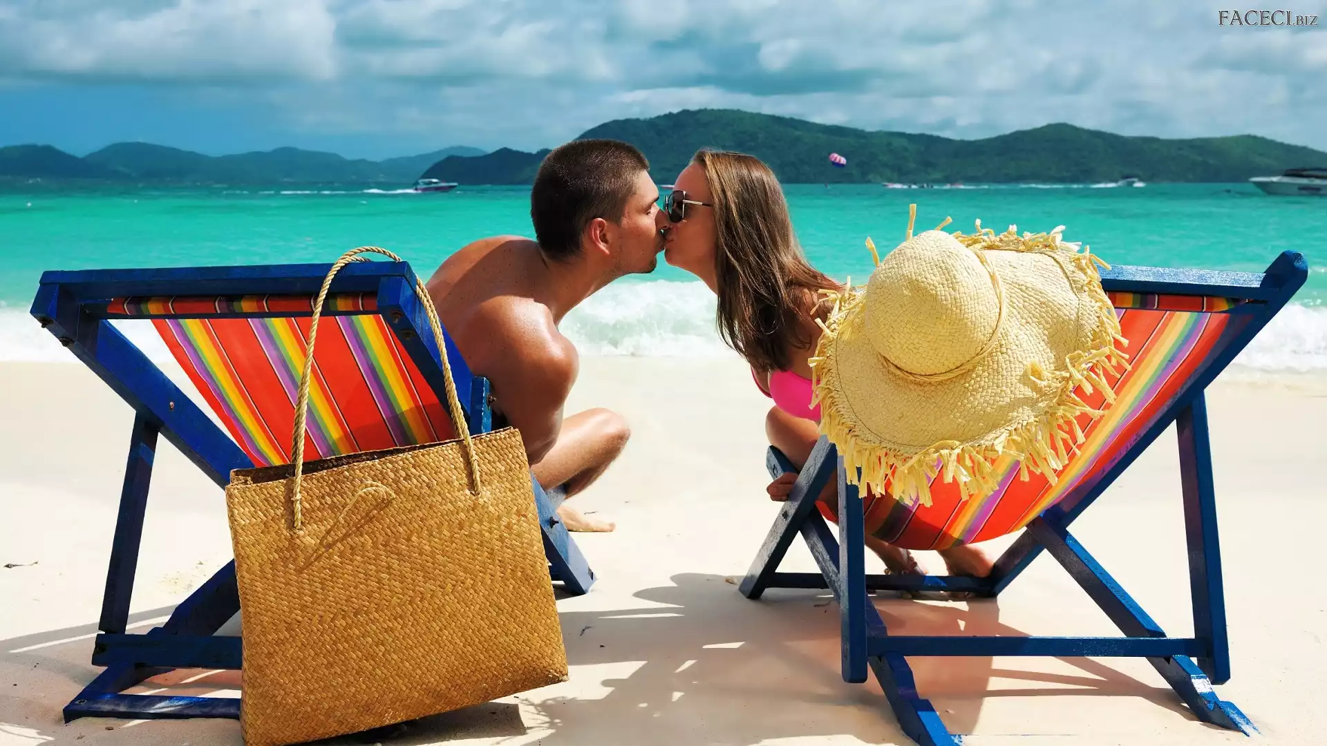 Morze, Kobieta, Kapelusz, Miłość, Plaża, Leżaki, Lato, Mężczyzna, Wakacje, Torba, Pocałunek - faceci.biz